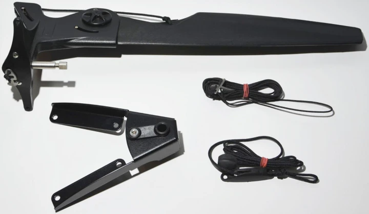 Steueranlage für Natseq Kajaks. Komplettset (Steuerkopf/-blatt, Beschläge, Steuerseile für Solo- und Tandembetrieb, Aufholseil und Schrauben) mit Einbauanleitung.