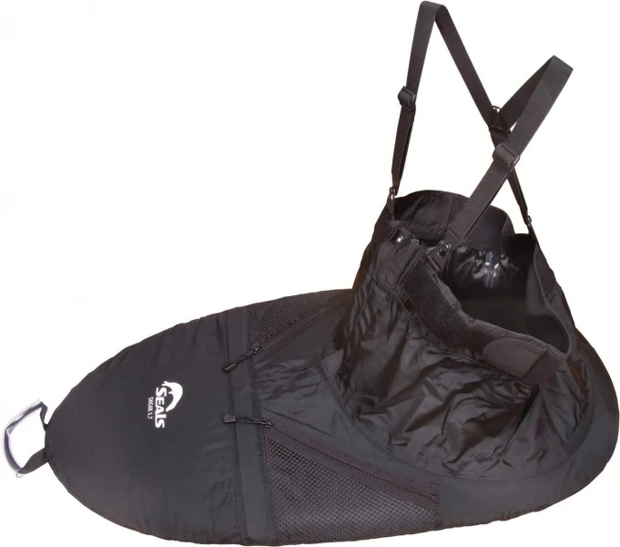Variabel zu nutzende Spritzdecke mit RV im Kamin und „Rim-Grip“ Süllrandabschluß mit rutschhemmender Oberfläche und verstellbarem Gummizug. Der Reißverschluß (! nicht 100% wasserdicht) sorgt bei schönem Wetter für ein angenehmes Klima und erleichtert das An- und Ausziehen der Decke. In den Spritzdeckenteller ist ein auf der Innenseite spannbarer Bügel angebracht, dieser sorgt für einen weitestgehend faltenfreien Sitz der Decke und verhindert die „Pfützenbildung“ auf dem Teller.